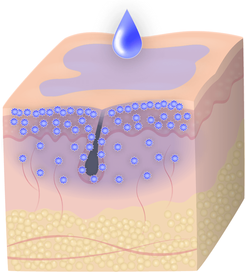 Proprietary hyliQ® carrier molecules transport solubilized active ingredients through the stratum corneum, preferably into the epidermis, into glands, or into hair follicles. By selection of specific carrier molecules, we can customize the properties of our drug products, enhancing targeted penetration into the skin tissues, increasing efficacy and reducing unwanted side effects.